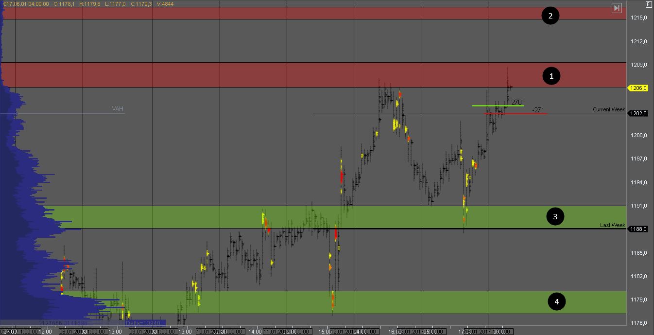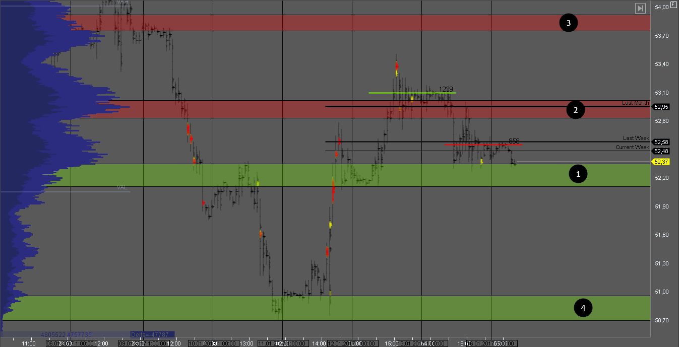 Продавец пытается продавить зону поддержки 1 и продолжить снижение к цели в зоне 4. В таком случае, можно будет рассматривать трендовые модели на продажу. Если покупатель удержит котировку выше зоны 1, покупки должны продолжиться к зоне 2, в которой находиться объем прошлого месяца. Пробив его, покупатель должен продолжить рост к зоне 3.