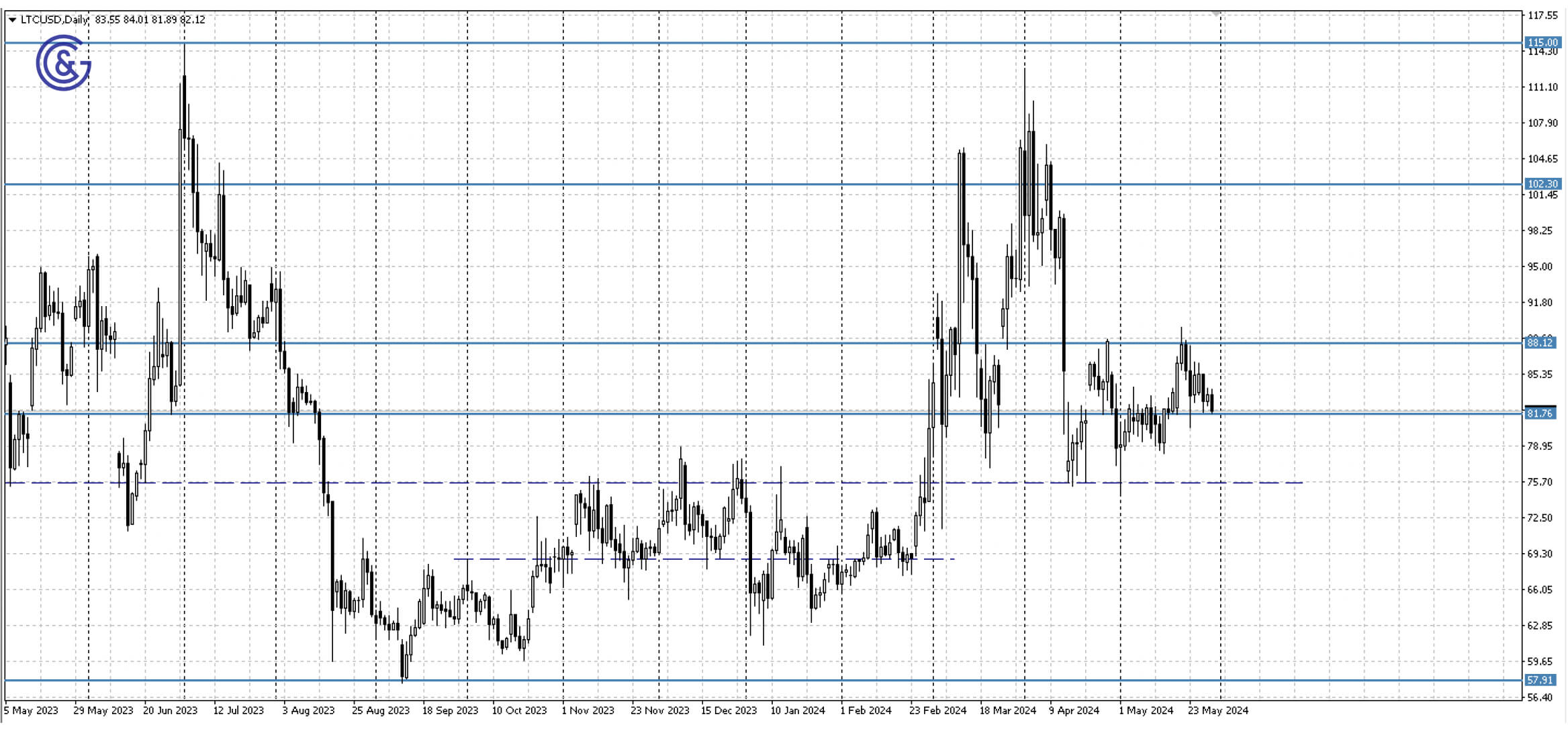 Litecoin отступил вниз от сопротивления 88,12 и вернулся к поддержке 81,76. В случае ее пробоя и закрепления ниже возможно продолжение снижения к пунктирному уровню 76,95. Альтернативным сценарием будет разворот вверх и восстановление в коридоре 81,76 - 88,12.